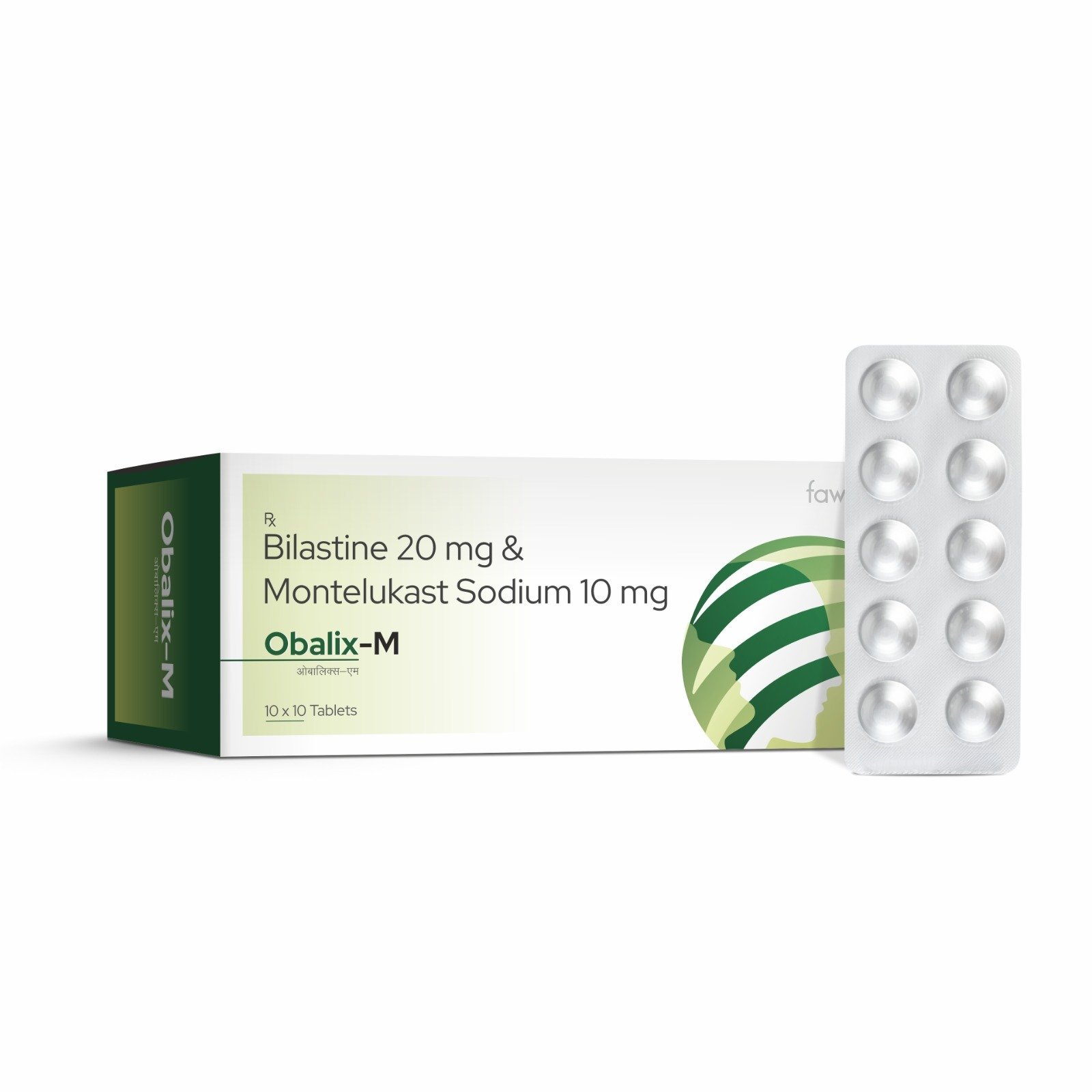OBALIX M: The Dual composition of Bilastine 20 mg + Montelukast 10 mg, where Bilastine is an antihistamine that blocks H1 receptors, relieving symptoms like itching, sneezing, and runny nose, and Montelukast is a leukotriene receptor antagonist that blocks inflammatory mediators, reducing symptoms like congestion, wheezing, and coughing.