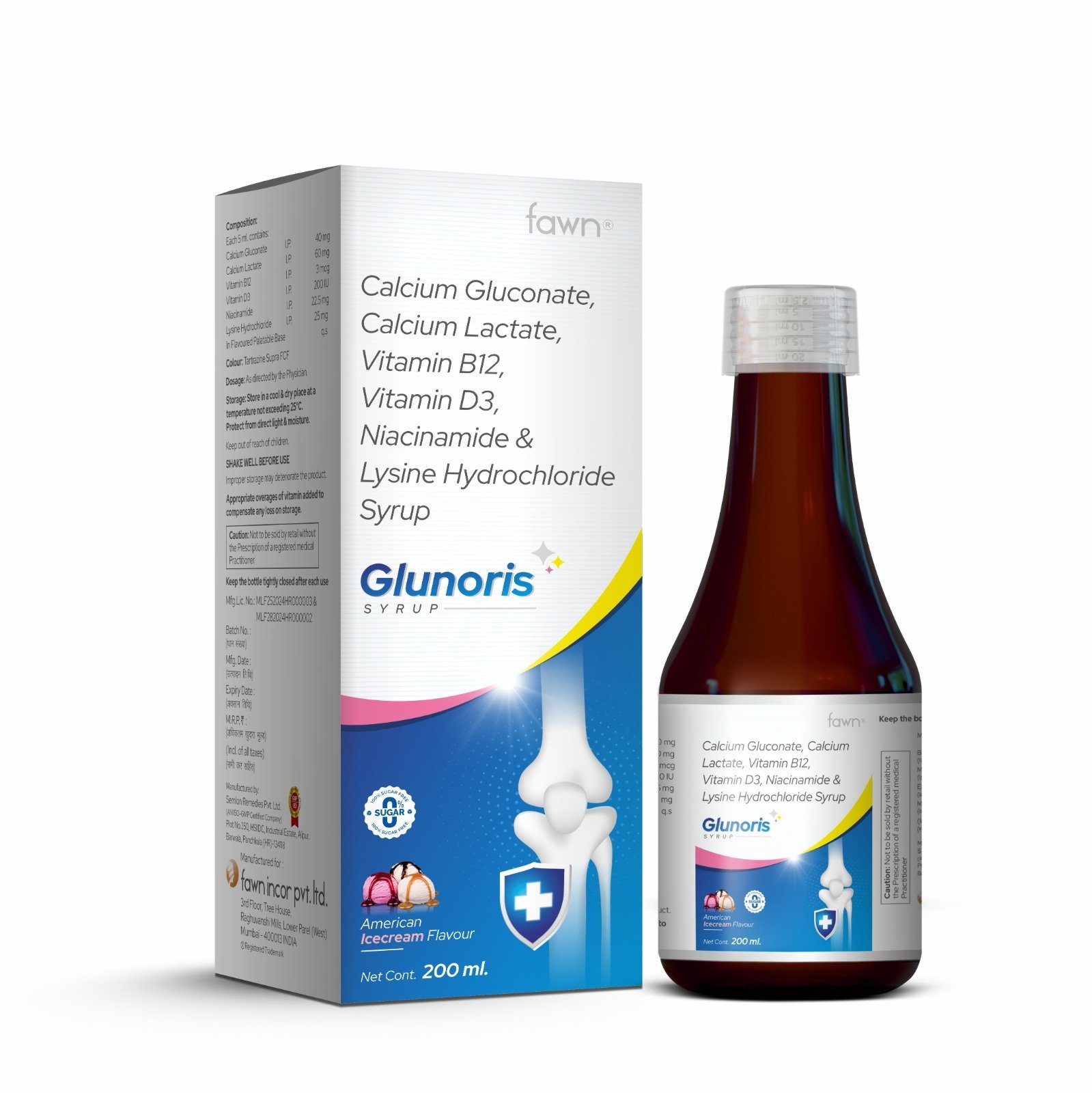 Calcium Gluconate, Calcium Lactate, Vitamin B12, Vitamin D3, Niacinamide & Lysine Hydrochloride Syrup – GLUNORIS Syrup