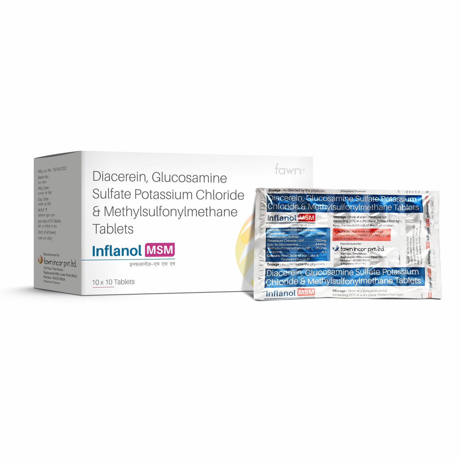 Diacerein 50 mg + Methylsulfonylmethane 250 mg + Glucosamine Sulfate Potassium Chloride 750 mg.