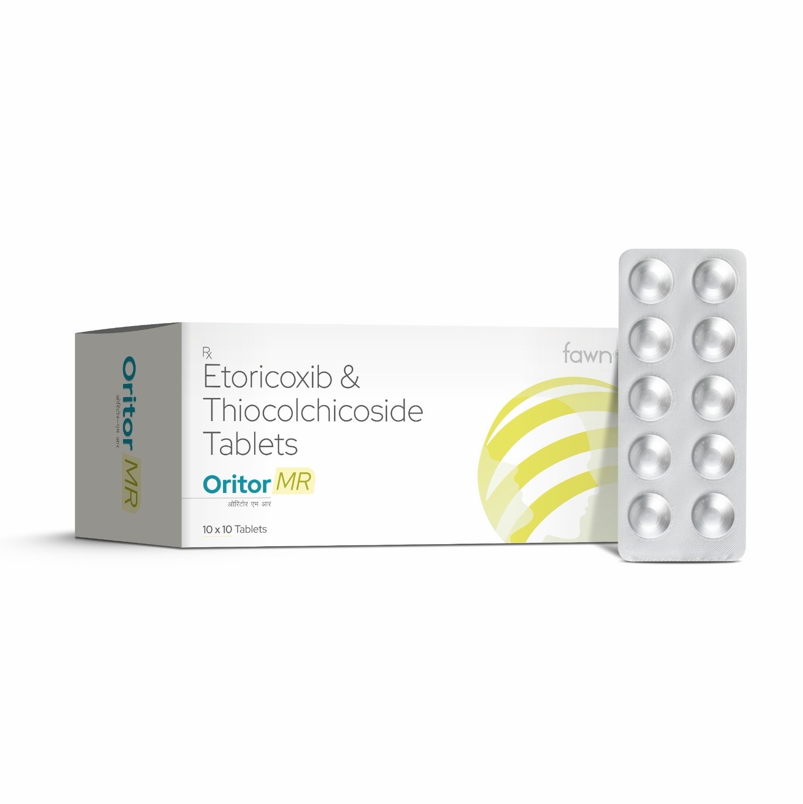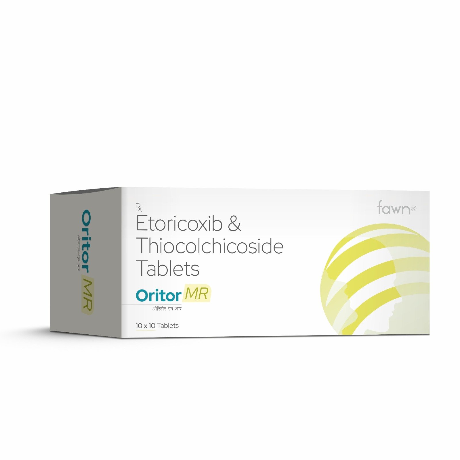 ORITOR MR: The Dual composition of Etoricoxib 60 mg + Thiocolchicoside 4mg is Etoricoxib, an NSAID derivative that is mainly used to treat pain, inflammation, and swelling symptoms in conditions like rheumatoid arthritis, osteoarthritis, gout, and ankylosing spondylitis. It acts by selectively blocking the COX-2 enzyme; it prevents the synthesis of prostaglandins, which cause pain, inflammation, and oedema. Thiocolchicoside is a muscle relaxant that is well-known for effectively reducing muscle stiffness and spasms. It relieves muscle spasms or stiffness by acting centrally in the brain and spinal cord. It enhances muscle mobility and reduces discomfort.