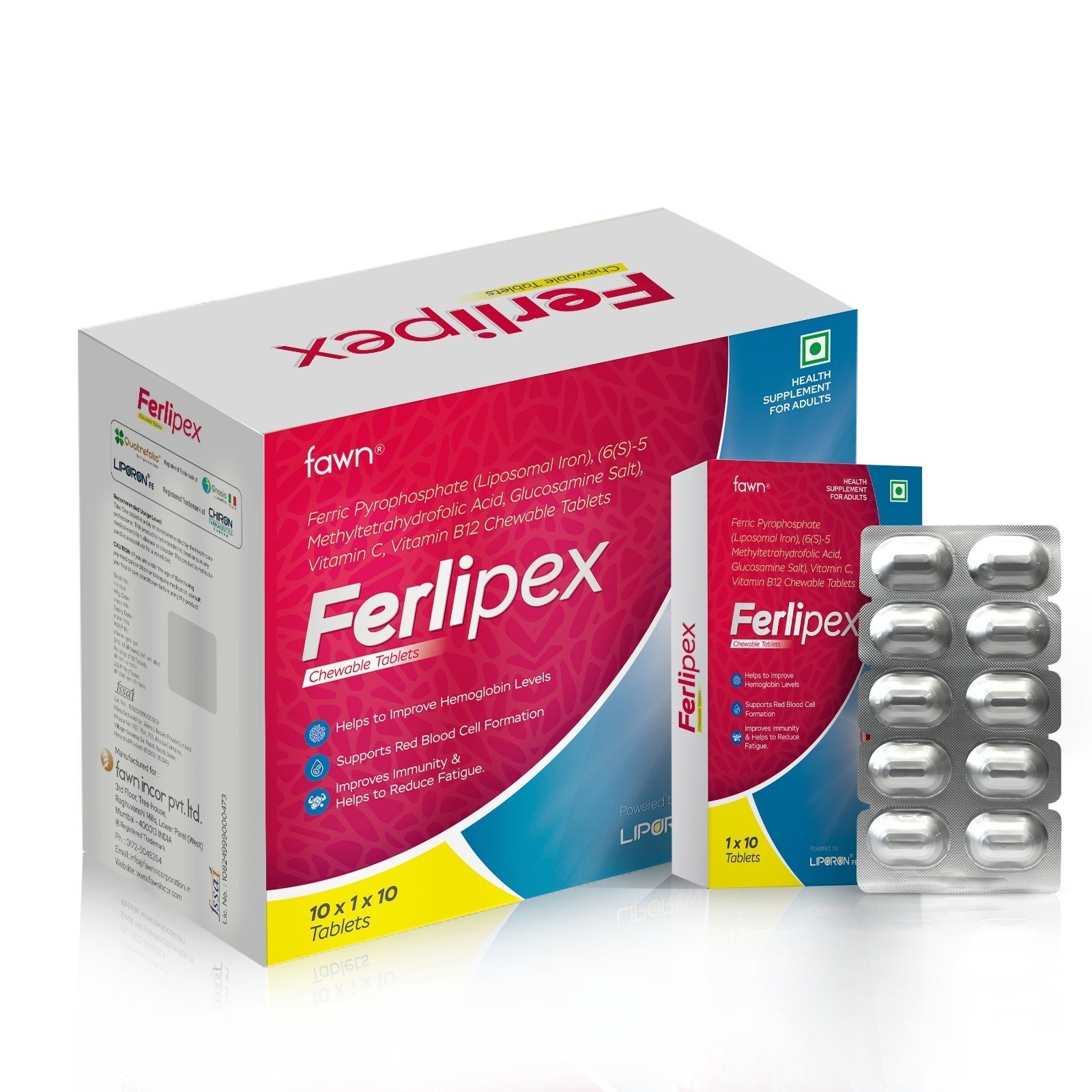 Each Chewable contains:- Quatrefolic equivalent to Folate((6S)5 Methyltetrahydrofolic acid, Glucosamine salt 220mcg, Ferric Phosphate as Liposomal Iron 29mg, Vitamin C 65mg, Vitamin B12 (Cyanocobalamin) 2.2mcg (Blueberry Flavour)