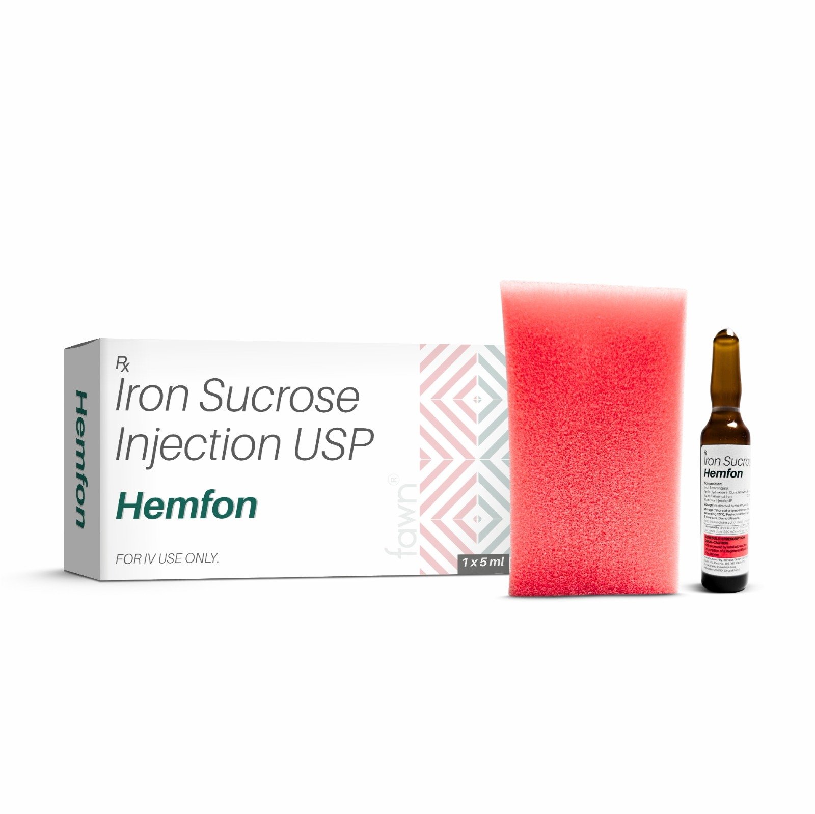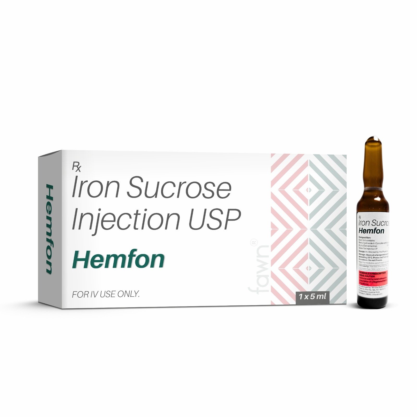 HEMFON Injection: The composition of Iron Sucrose Injection USP is Iron Sucrose, a stable complex of iron hydroxide and sucrose, designed for intravenous administration. It ensures efficient delivery of elemental iron required for haemoglobin production and replenishing iron stores in patients with moderate to severe iron deficiency anaemia.
