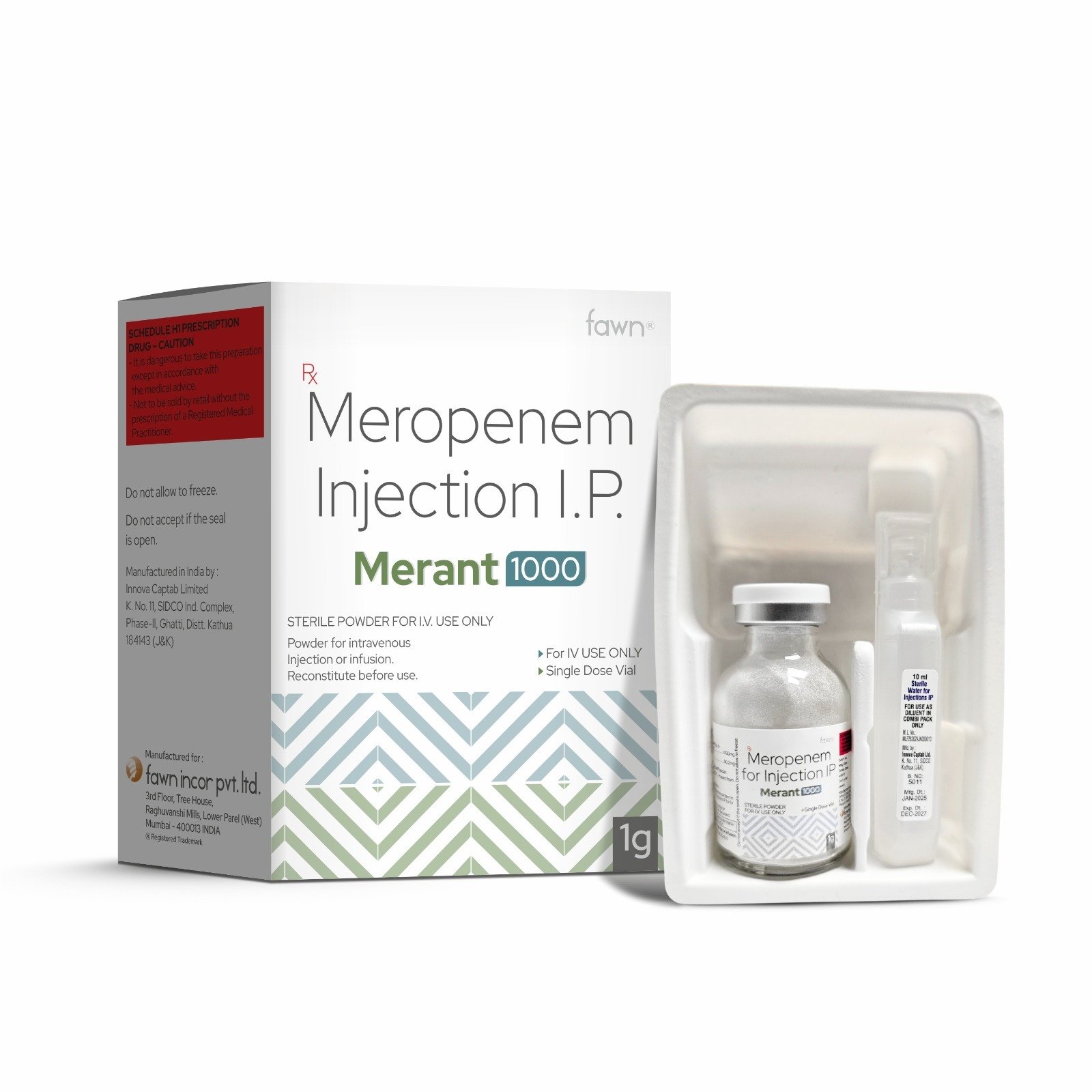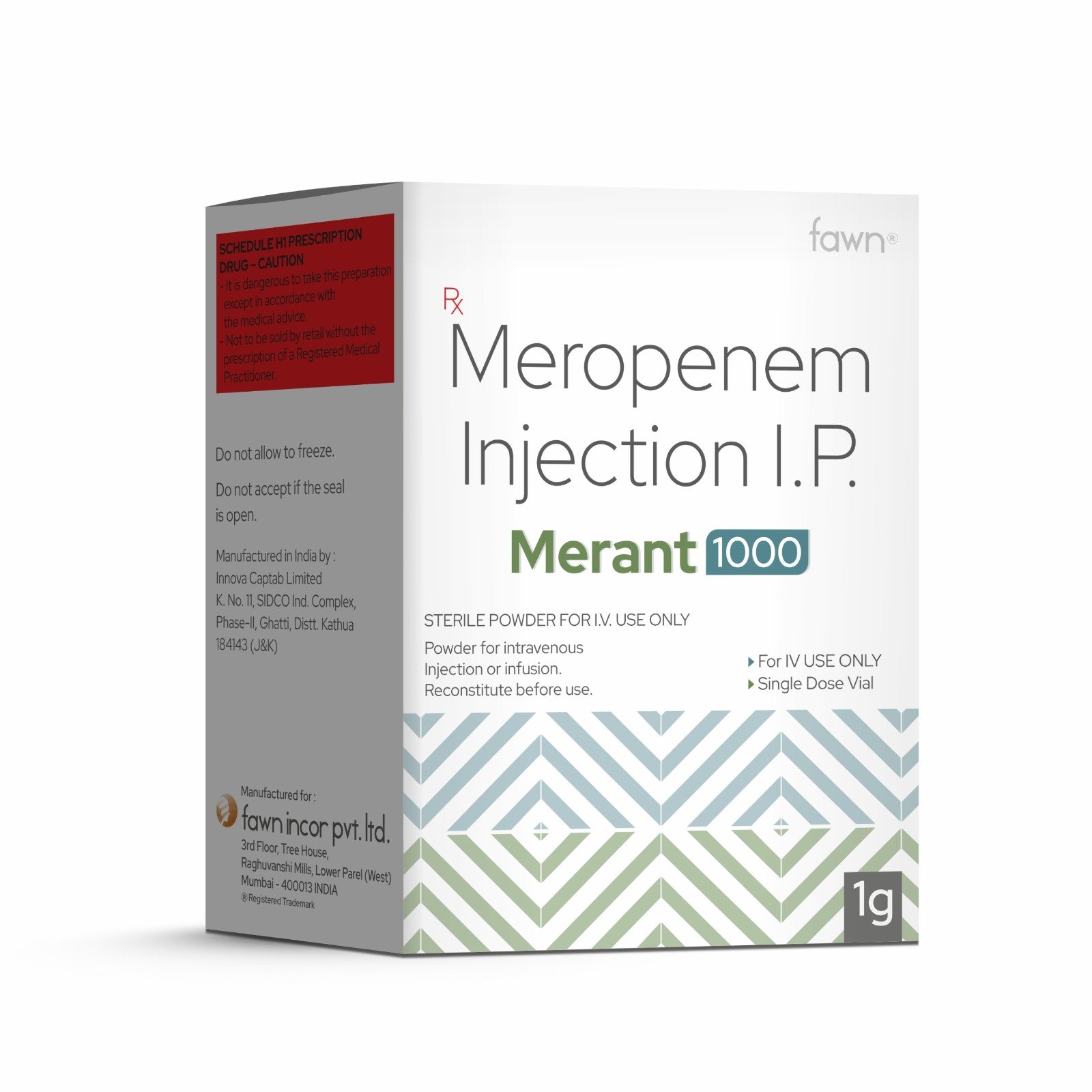 MERANT 1000: The composition of Meropenem 1gm is a broad-spectrum carbapenem antibiotic used to treat severe bacterial infections. It works by inhibiting bacterial cell wall synthesis, leading to bacterial cell death.
